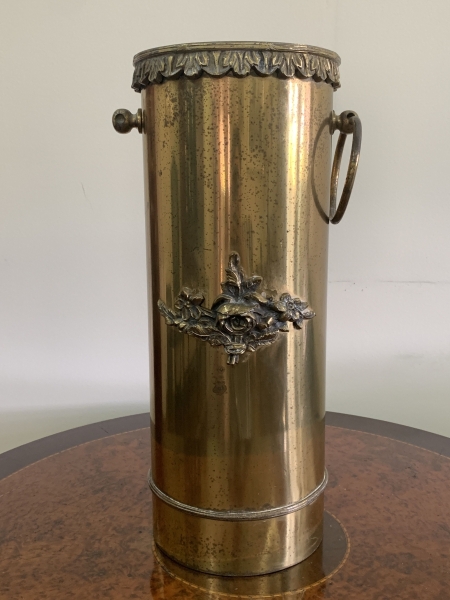 • Porta-guarda-chuvas em metal dourado com aplicações ornamentais em bronze. Apresenta ausência de uma das alças e sinais de uso e oxidação. Altura 50cm, diâmetro 20cm.