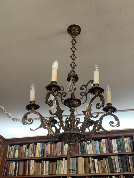 • Lustre em bronze ricamente trabalhado, com seis braços curvos e soquetes para lâmpadas em formato de vela. Corpo central ornamentado e adornado com seis pingentes em cristal facetado. Apresenta detalhes decorativos em relevo e corrente superior em metal. Caimento 110cm, diâmetro 60cm.