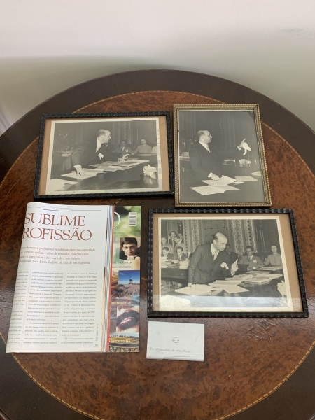 • Conjunto composto por 3 antigas fotografias do advogado Oswaldo de Lia Pires em atuação em tribunais de júri. Acompanha revista com matéria alusiva a ele porta cartões em metal com gravação nominal - Oswaldo de Lia Pires.