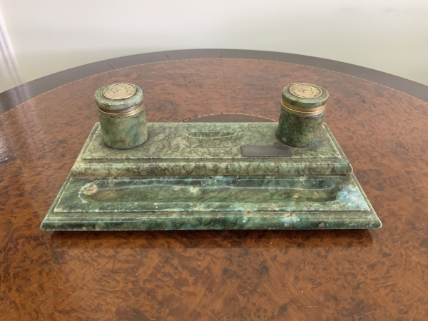 • Tinteiro de mesa em pedra alabastro italiana, com dois reservatórios e tampas decoradas com moedas metálicas aplicadas. Apresenta um dos reservatórios com a tampa e a moeda desprendidas. Largura 30cm.