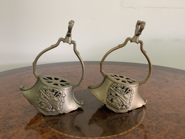 • Par de estribos antigos em bronze, com armação vazada e alças trabalhadas, apresentando na face frontal aplicação em relevo com instrumentos musicais entrelaçados por ramos decorativos. Parte superior com inscrição interna `DEPOSE`. Altura 18cm.