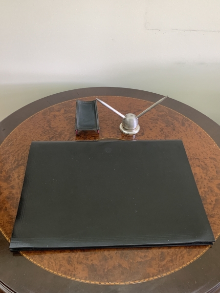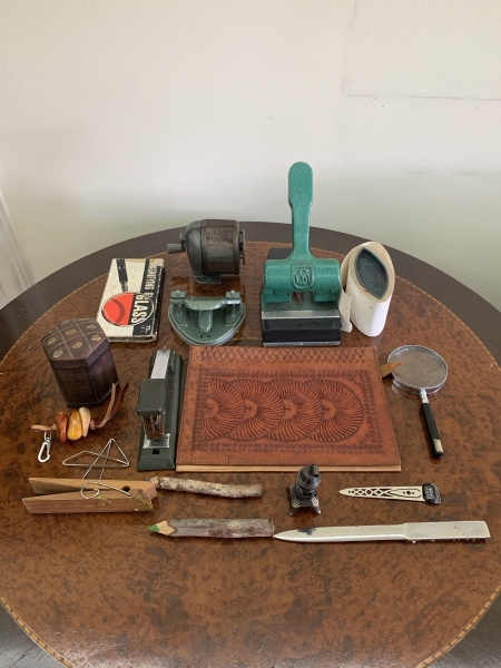 • Lote composto por acessórios diversos para escritório com destaque para abridor de cartas em marfim e outros materiais, antigo apontador de mesa em metal, mata-borrão, lupa de aumento com cabo, grampeador, furador de papel e outros utensílios correlatos