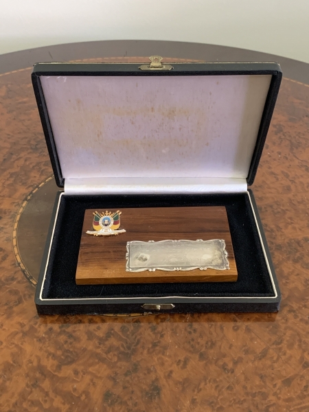 • Placa em prata aplicada sobre base em madeira, alusiva ao Dr. Oswaldo Lia Pires, com brasão esmaltado do Estado do Rio Grande do Sul e inscrição comemorativa gravada. Acompanha estojo original. Medidas 8x13cm.