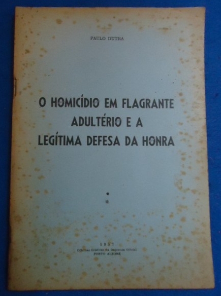 • Direito - O Homicídio em flagrante adultério e a legítima defesa da honra - Autor: Paulo Dutra - Português Br - Editora: OFIO - 1957 - Brochura,acabamento com grampos, 70 pags, capa,corte do livro e paginas amareladas com manchas devido a ação do tempo e a qualidade do papel, com dedicatória do autor para o Dr. Oswaldo Lia Pires, algumas paginas com anotações e sublinhados, formato do livro 16x23 cm.** O livro aborda um tema que foi objeto de grande debate jurídico no Brasil por décadas. A tese da `legítima defesa da honra` foi recentemente declarada inconstitucional pelo Supremo Tribunal Federal (STF) em 2021 e 2023, por unanimidade, em casos de feminicídio e agressões contra a mulher, por violar princípios constitucionais como a dignidade da pessoa humana e a proteção à vida. O livro de Paulo Dutra provavelmente representa uma perspectiva jurídica da época (1957), anterior a essas mudanças legais e entendimentos atuais.