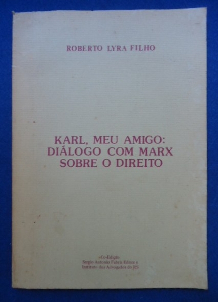 • Direito - Karl, Meu amigo: Diálogo com Marx sobre o direito - Autor: Roberto Lyra Filho - Português Br - Editora: Co-Edição Sergio Antonio Fabris Editor y Instituto dos Advogados do RS - 1983 - Brochura,96 pags, capa,corte do livro e paginas amareladas com manchas devido a ação do tempo e a qualidade do papel, obra sem riscos, formato do livro 15x22 cm.**é um texto fundamental para a compreensão da teoria crítica e dialética do Direito no Brasil, estruturado como um debate imaginário com Karl Marx.A obra oferece uma reinterpretação do pensamento de Marx sobre o fenômeno jurídico, buscando superar visões simplistas que o reduzem a mero instrumento de dominação de classe. Lyra Filho propõe uma leitura dialética que reconhece as contradições internas do Direito e sua potencialidade emancipatória.