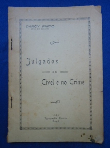 • Direito - Julgados no civel e no crime - Autor: Darcy Pinto (Juiz de direito) - Português Br - Editora: Typographia Minerva - 1939 - Brochura, acabamento com grampos, 107 pags, capa e lombada com descascado, capa,corte do livro e paginas amareladas com manchas devido a ação do tempo e a qualidade do papel, obra sem riscos, formato do livro 16x23 cm.
