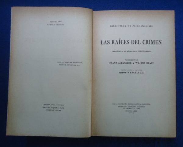 • Direito - Las Raíces del Crimen: Psicoanálisis de los móviles de la conducta criminal (Biblioteca de Psicoanálisis) - Autor: Franz Alexander y William Healy - Espanhol - Editora: Schapire - 1946 - Capa dura, 324 pags, capa desbotada, corte do livro e paginas amareladas com manchas devido a ação do tempo e a qualidade do papel, com dedicatória que não é do autor na folha de rosto, algumas paginas com anotações, sublinhados e grifos, formato do livro 16x23 cm.**Esta obra é um pilar da criminologia clínica que aplica os princípios deA psicanálise para desvendar as motivações inconscientes por trás do crime. Propõe que o comportamento criminoso não é puramente lógico ou genético, mas frequentemente surge de conflitos emocionais , distúrbios instintivos e da busca pela gratificação de impulsos que o indivíduo não consegue canalizar de forma socialmente aceitável