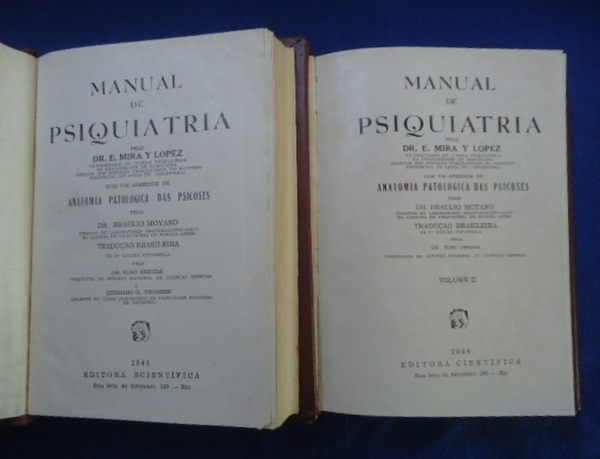 • Direito - Manual de Psiquiatria Volume 1 e 2 - Autor: Dr. E. Mira y Lopez (Com um Apêndice de Anatomia Patologica das Psicoses pelo Dr. Braulio Moyano - Tradução Brasileira da 2ªEdição Espanhola pelo Dr. Elso Arruda) - Português Br - Editora: Científica - 1944 - Livro 1, Capa dura, 550 pags, corte do livro e paginas amareladas devido a ação do tempo e a qualidade do papel, algumas paginas com anotações, sublinhados e grifos, livro em bom estado de conservação, formato do livro 17x24 cm.*********Livro 2, Capa dura,422 pags, corte do livro e paginas amareladas devido a ação do tempo e a qualidade do papel, algumas paginas com anotações, sublinhados e grifos, livro em bom estado de conservação, formato do livro 17x24 cm.** é uma obra clássica e fundamental para a história da psiquiatria e psicologia no Brasil.O manual é comumente dividido em duas partes principais distribuídas em seus volumes: