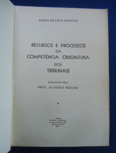 • Direito - Recursos e processos da competência originária dos tribunais - Autor: Pedro Batista Martins (Atualizado pelo Prof. Alfredo Buzaid) - Potuguês Br - Editora: Revista Forense - 1957 - Capa dura, 484 pags, corte do livro e paginas amareladas devido a ação do tempo e a qualidade do papel, livro em bom estado de conservação, sem riscos, formato do livro 16x24 cm.** é um clássico da literatura jurídica processual brasileira.O livro aborda de forma sistemática as ações que se iniciam diretamente nos tribunais superiores e de segunda instância, bem como os meios de impugnação de decisões.Principais Temas Abordados
