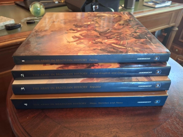 • Livros - lote com 3 álbuns + caixa com complementos - The Army In Brazilian History Colony, United Kingdom And Empire e the army Brazilian History Republic + caixa com complementos - Bibliex - Capa dura –1998 - 30x30 - em ingles, capas duras originais em muito bom estado.