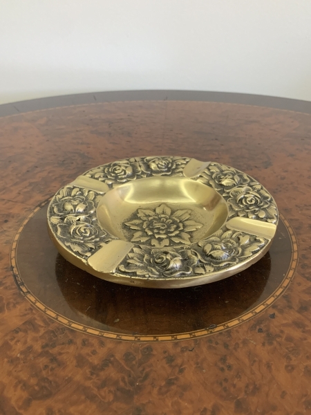 • Cinzeiro em bronze, formato circular, diâmetro 13cm. Borda decorada em relevo com motivos florais em sequência e quatro apoios para cigarro. Centro igualmente ornado com flor em relevo. Apresenta pátina natural e sinais compatíveis com o tempo.
