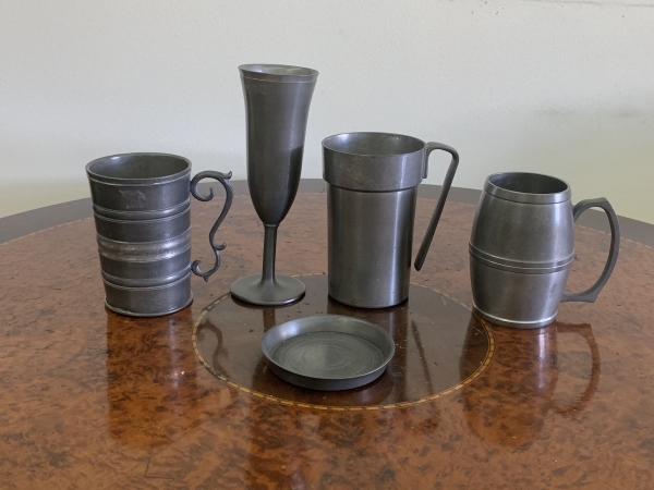 • Lote composto por cinco itens em estanho, incluindo canecas, cálice, porta copos e prato raso. Altura da maior peça: 18cm. Apresentam pátina e sinais compatíveis com o tempo e uso