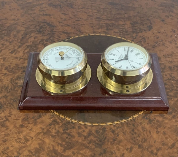• Conjunto alemão composto por barômetro e relógio em metal dourado, fixados sobre base com moldura em madeira. Mostradores com numeração romana e indicação meteorológica. Medidas totais: 22x12cm