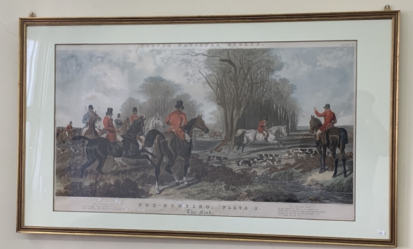 • Impressão emoldurada representando cena de caça inglesa intitulada Fox-Hunting, Plate 2  The Find. Composição figurativa com cavaleiros trajando casacas vermelhas e matilha em campo aberto. Acompanha moldura com paspatur. Medidas totais: 60x105cm. Apresenta marcas do tempo.