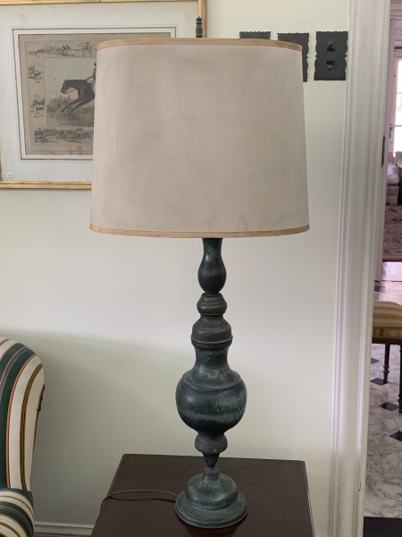 • Abajur em metal patinado, com fuste torneado e base circular. Acompanha cúpula em tecido. Altura total: 109cm. Apresenta marcas do tempo e uso